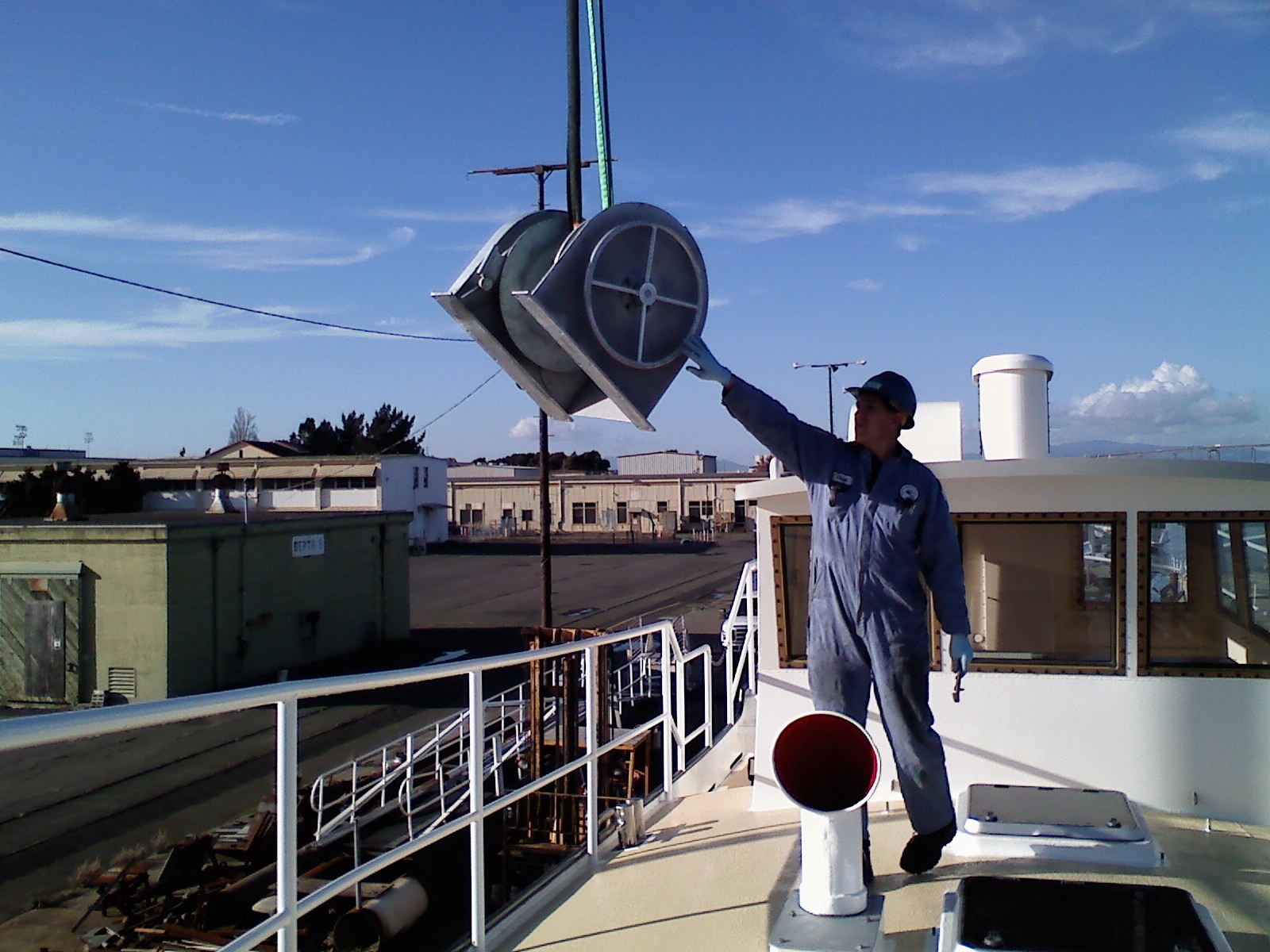Here are a bunch of pictures from the last week of assembling and installing our anchor winch. We had plans to stage a crane on-site for one day to do a job on one of the Baylink ferries. I put our anchor winch project on the front burner so we could get it assembled in time to use this crane for our installation while it was here. I had completely disassembled and cleaned all the parts last winter and so they were ready for the galvanizer. Here they were dipped in a nice bath of molten zinc which should protect all the parts from corrosion for many years to come. Since it had been a year since I took the thing apart, it took a little head scratching to figure out how all the bits and pieces went back together - next time I need to take more pictures. The winch body and drum are very heavily built from 5/16" steel. The main shaft is 1.5" stainless steel riding in bronze bearings with grease fittings. It is powered by a hydraulic motor that turns a chain drive running in an oil bath. There is a clutch type assembly with a large clutch pad on either side of the drum. This allows you to engage/disengage the drum from the shaft by turning the large hand wheel on the port side of the winch. A nice robust design that shouldn't give us any problems, and will be easy to fix if it does...