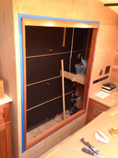 I know it's technically a "hanging locker" as we are talking about a boat here, but this cabinet is spacious enough that I'm going to call it a closet. There are two closet rods (high and low) and the closet runs about six feet long. The lower closet rod is only about four feet long because of some plumbing and electrical stuff coming back through the bulkhead from the Engine Room, but the upper rod is full length. The space holds a surprising amount of clothes... Two things that we tackled recently are access and ventilation. For closet access, we installed a nice pair of Lyptus wood sliding doors that match the rest of the cabinets. These slide in a frame that we made from 3/4" mahogany stock. The mahogany grain is different than the Lyptus doors, but the color match with just a clear coat of varnish is pretty good I think, and the mahogany is easier to source than the Lyptus for little projects like these. I still have to work on the slide track and install some UHMW plastic glides on the bottom of the doors so that they slide smoothly. From past experience, we know that ventilation is critical for a locker stuffed with clothes on a boat. Once you get any kind of mustiness going, it's very hard to get rid of. In this closet, I ran the hydronic heating line through a length of 3/4 copper pipe that is secured on brackets at the back of the closet near the floor. Whenever the furnace is running, this radiates nicely and sets up an up-draft inside the closet. Fresh air is drawn in through two vents at the bottom of the closet under the doors, and exits through vents at the top of the closet. We also installed cedar planking along the back wall of the closet. Kind of smells like a hamster cage right now, but once the cedar "ages" a bit it will keep everything smelling fresh. I've also heard that the cedar is a natural deterrent for moths and other bugs. We'll see...